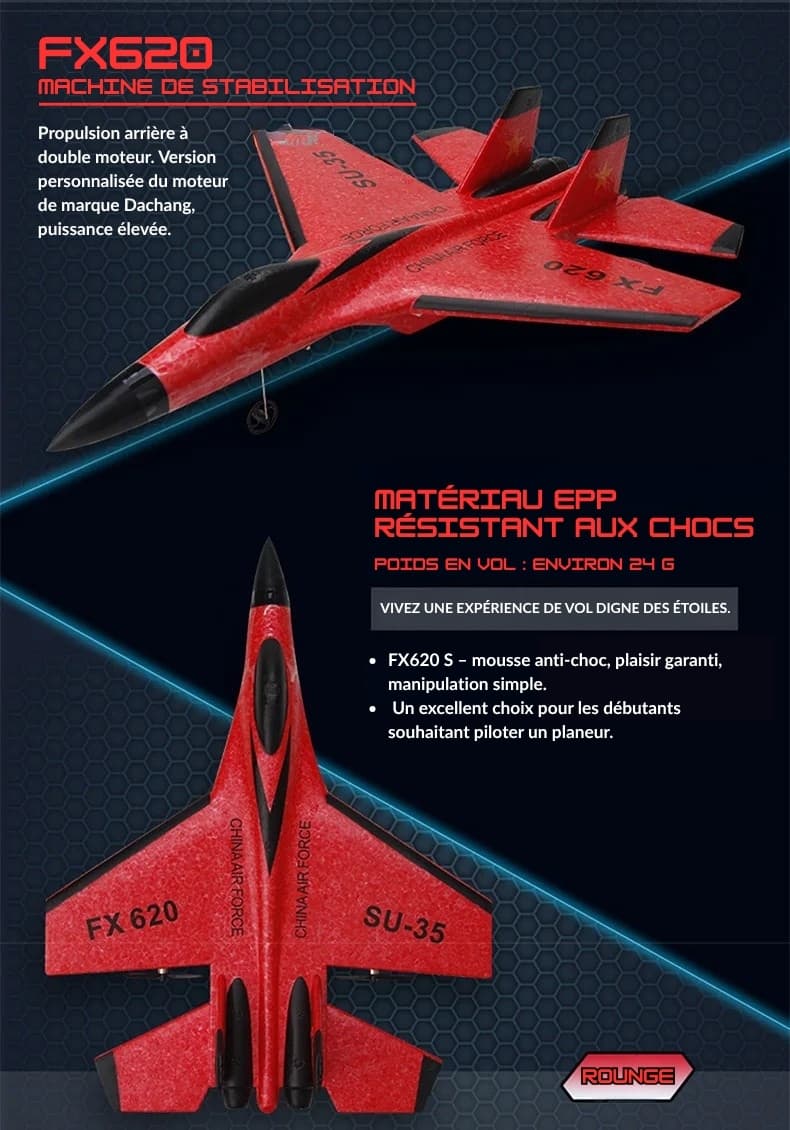 Découvrez la sensation unique de piloter le Drone Avion FX620, un modèle pensé pour les aventuriers du ciel. Léger, résistant et simple à manier, il offre un vol stable et précis même dans le vent léger. Sa mousse EPP flexible protège l’avion des chocs et assure une durabilité exceptionnelle. Avec son design aérodynamique inspiré des avions de chasse, il allie style et performance pour des heures de jeu captivantes.